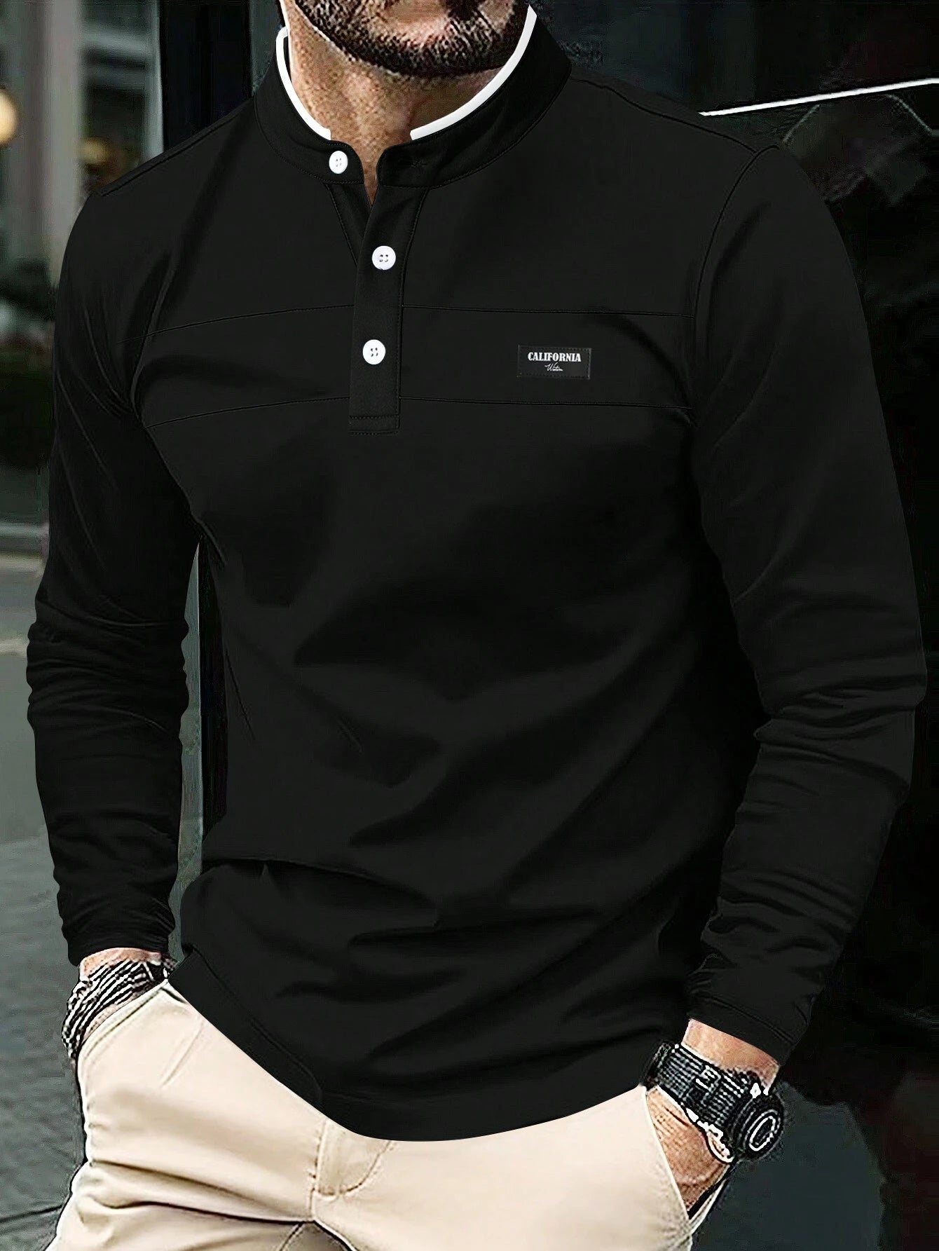 Camibuso negro de Estilo Black con cuello mao y detalles minimalistas. Elegancia casual con un aire sofisticado y moderno.